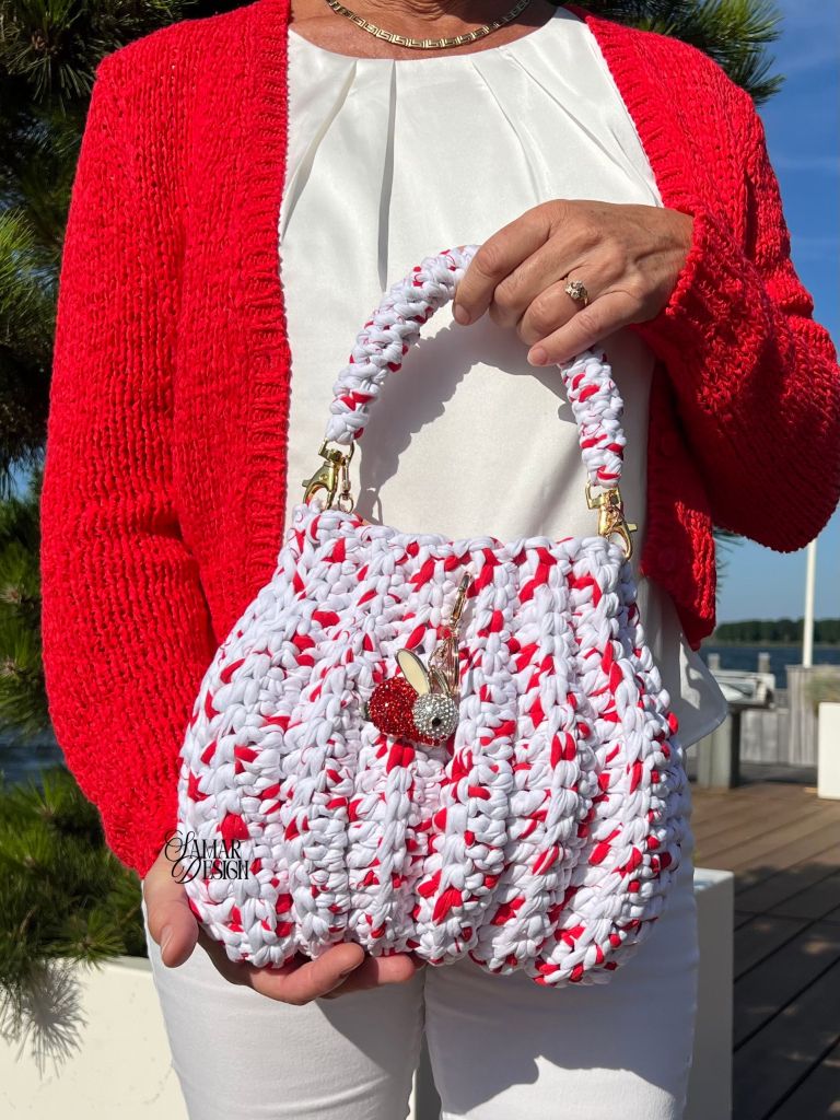 Handgemaakte Gehaakte Tas – Exclusieve Pompoen vorm in rood met wit € 125,00