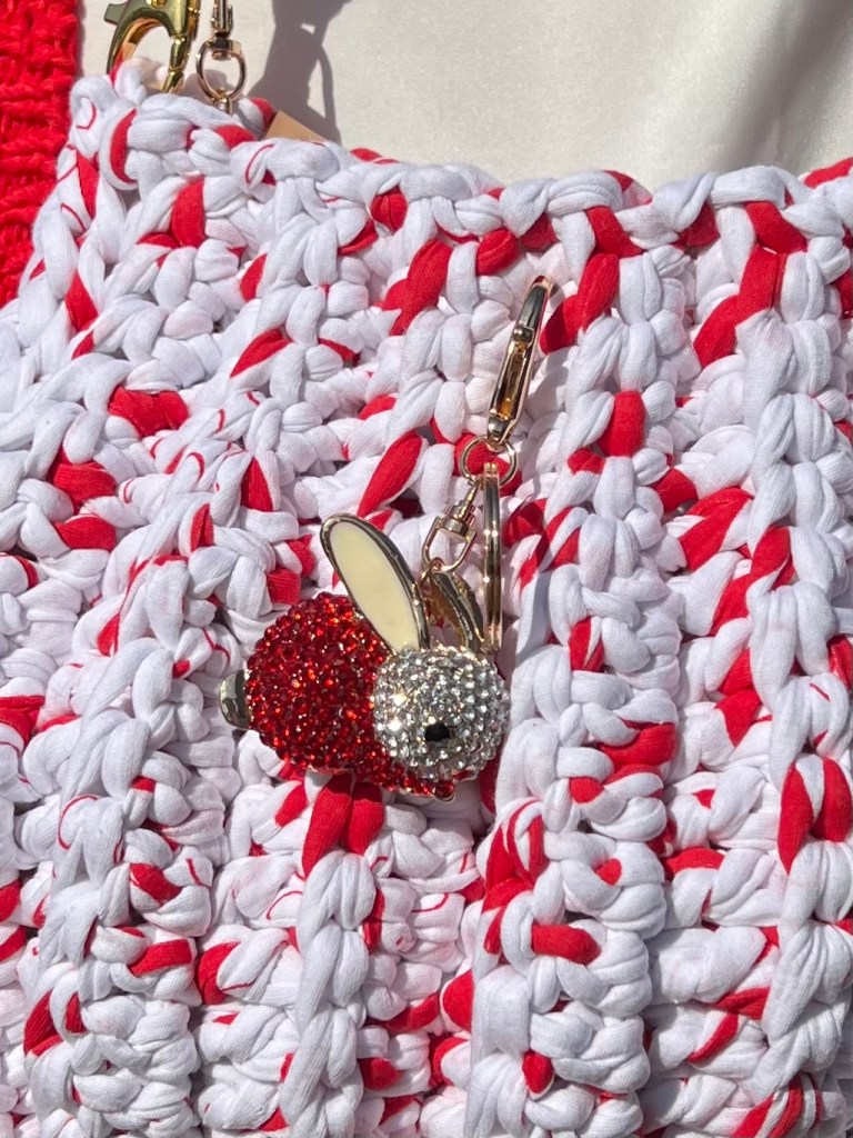 Voorzien van een grote tashanger met konijntje, welke bezet met strass steentjes – een echte eyecatcher