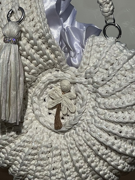 Ontdek de perfecte mix van handwerk, luxe en originaliteit met deze schitterende hand gehaakte tas. Het glanzende leather look garen geeft een elegante uitstraling, terwijl de unieke schelpvorm direct alle aandacht trekt.